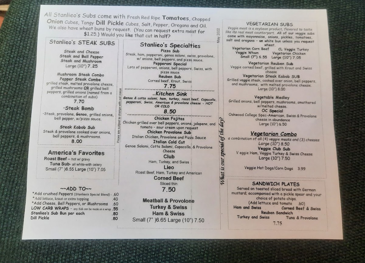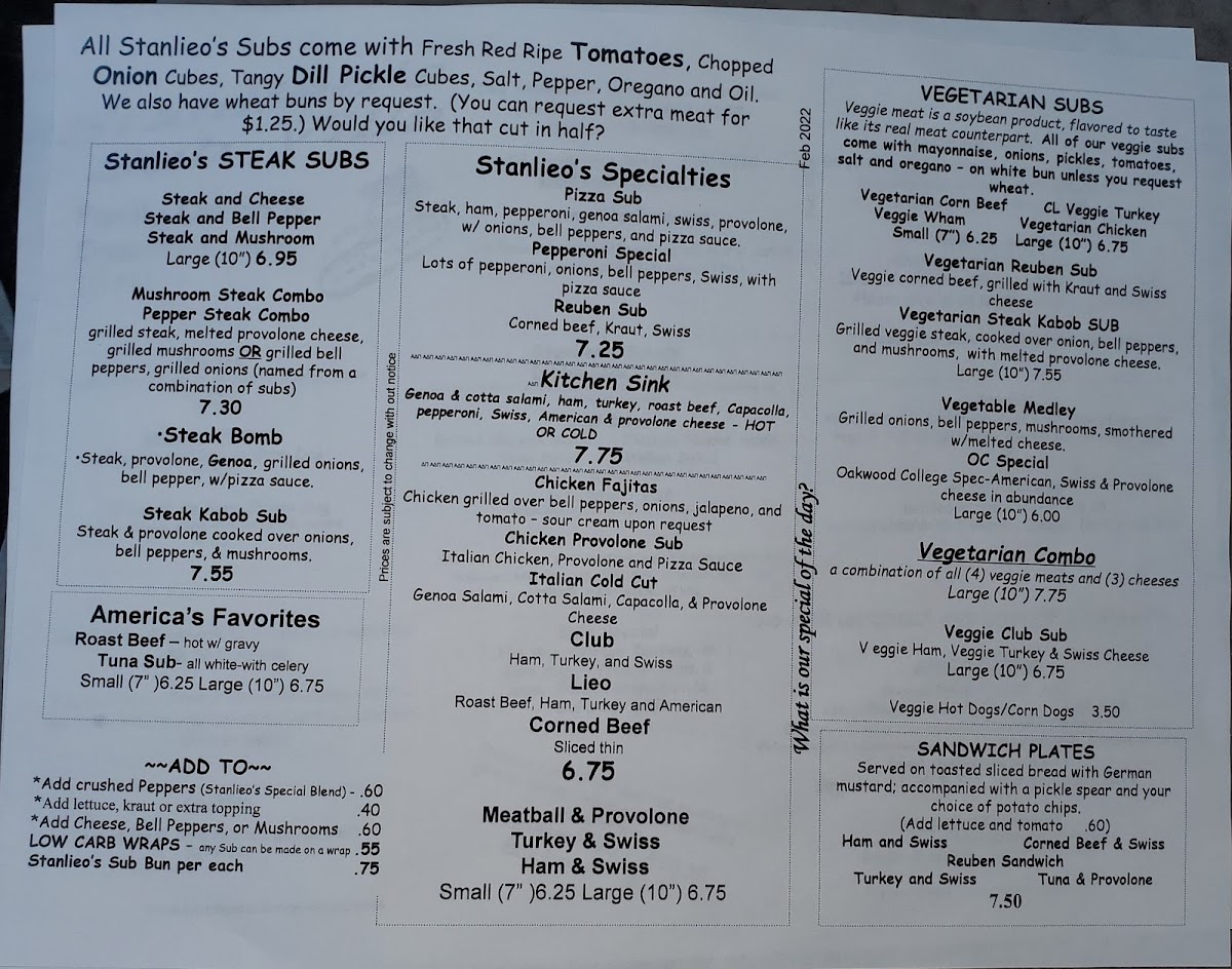 Welcome to Stanlieo's Sub Villa - Huntsville, a cherished local gem at 602 Governors Dr SW. This sub shop excels in both warmth and flavor, offering an impressive array of menu options that cater to all taste buds. For meat lovers, the 10" Steak and Cheese Sub and the flavorful Steak Bomb Sub are must-tries, showcasing grilled steak paired with melted provolone and vibrant veggies. But vegetarians need not feel left out; the menu boasts a delightful variety, featuring options like the Veggie Reuben and the indulgent Kitchen Sink Sub.
